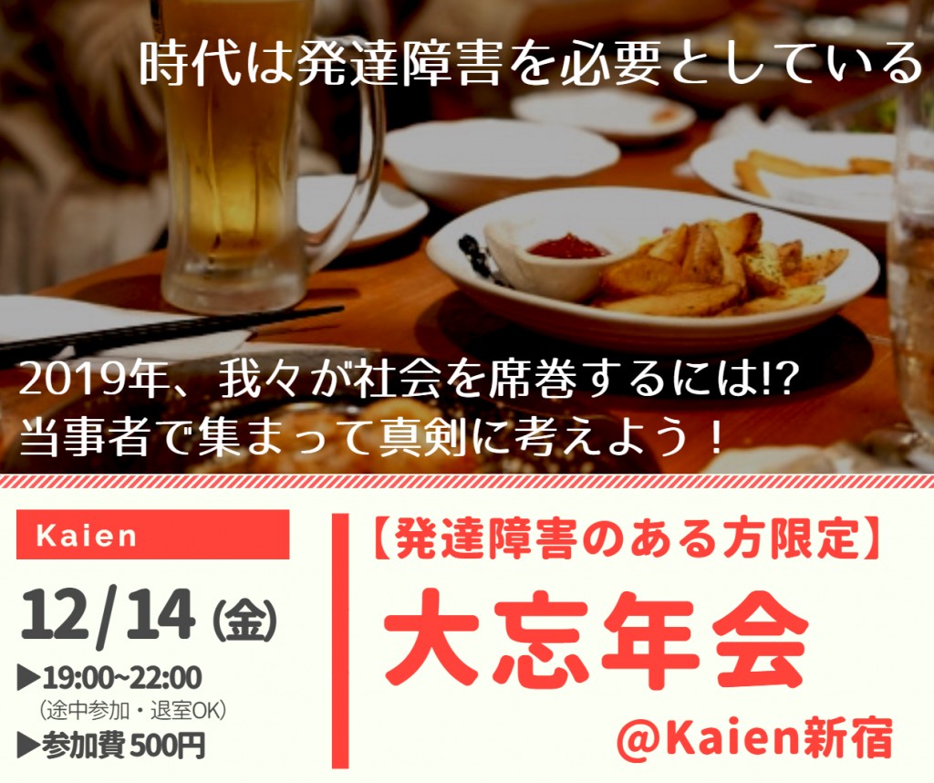 2019年、発達障害*が社会を席巻するために本当に必要なモノはなに!? 当事者の皆様にお集まりいただき(おいしいお酒とおつまみと片手に)、発達障害の未来を真剣に考える忘年会を開催します!
