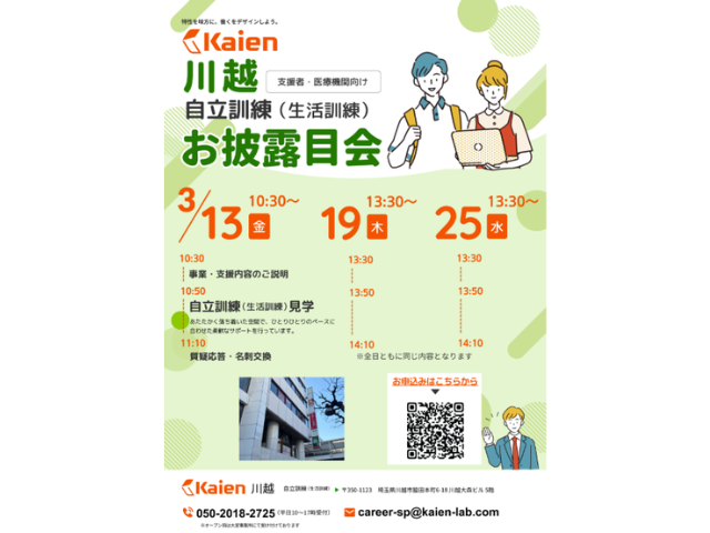 このたび、2026年4月1日に、自立訓練(生活訓練)事業所「Kaien川越」が開所する運びとなりました。
