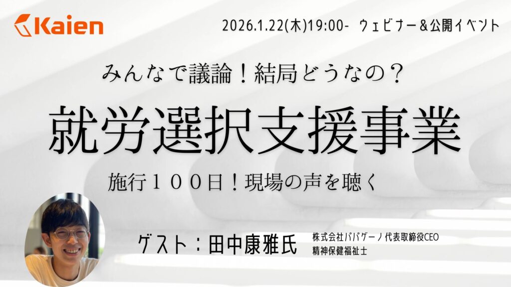 そこで、施行100日という節目にあたり「みんなで議論!結局どうなの?就労選択支援事業施行100日!現場の声を聴く」と題したウェビナー&公開イベントを開催します。