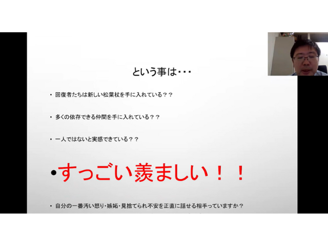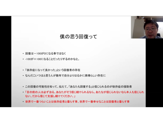 依存症になった経験が「なかったこと」になるのではなく、「特別な、価値ある経験をした」と思えるようになることこそが、理想的なゴールです。そして、当事者やその支援者には、その「ギフト」を手に入れるチャンスが与えられているのです。