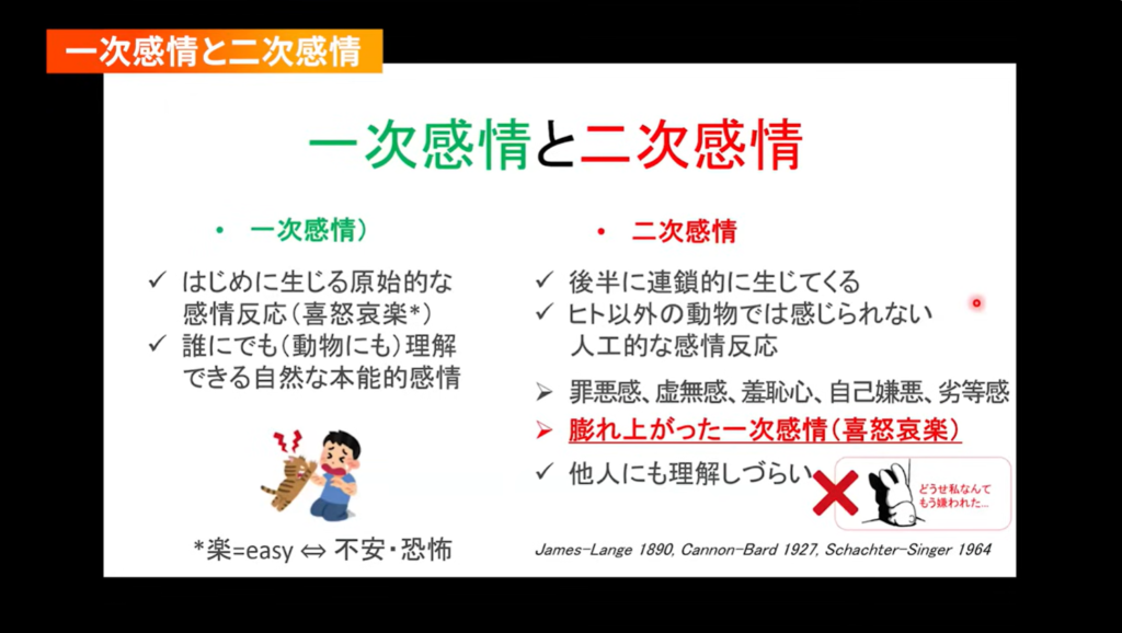 | 二次感情(偽装) | ・後半に連鎖的に出てくる人工的な感情反応・他人にも理解しづらい | ・罪悪感、虚無感、自己嫌悪、劣等感など・膨れ上がった一次感情 |