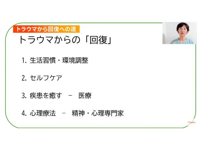 回復を始めるには、まず自分の状態や二次的な影響を理解することが大切です。服部先生は、トラウマ回復に向けた4つのステップを提案しています。