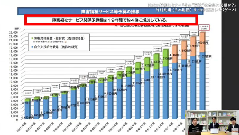 まず示されたのは、厚生労働省が公表した障害福祉費の推移です。障害福祉サービス全体の予算は、この20年弱で約4倍に拡大し、2兆円を超えています。就労継続支援B型だけでも、前年度比で1000億円増の約6279億円に達しています。