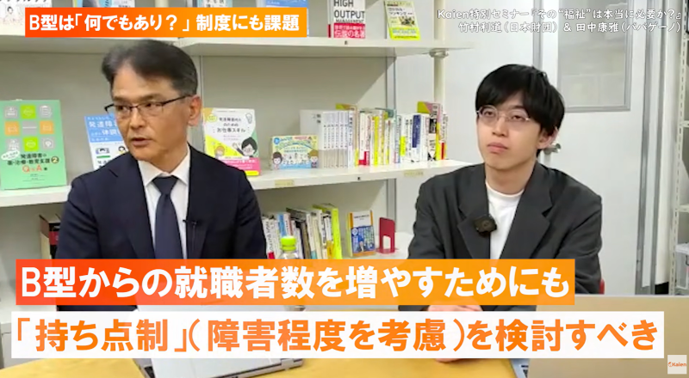 竹村氏はこの問題への対策として、車椅子バスケットボールの「持ち点制度」を応用し、区分なしの利用者が増えれば自動的に一般就労へ移行する仕組みを提案しました。「B型に誰でもいつまでも通っていいという状態を変えるために、循環の仕組みが必要だ」というものです。